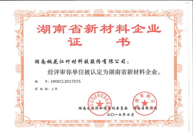 2017年7月,湖南省經(jīng)濟和信息化委員會、湖南省統(tǒng)計局為湖南桃花江竹材科技股份有限公司正式頒發(fā)“湖南省新材料企業(yè)”證書(證書編號:HNXCL2017075)。湖南省新材料企業(yè)的認定,標志著湖南桃花江竹材科技在新型竹材領域的成績得到國家認可與支持,是一項具有含金量的突破性榮譽。作為中國竹業(yè)龍頭企業(yè),湖南桃花江竹材科技一直走在新型竹材研發(fā)、運用和推廣的前沿,為全球竹產(chǎn)業(yè)的發(fā)展持續(xù)貢獻力量。
