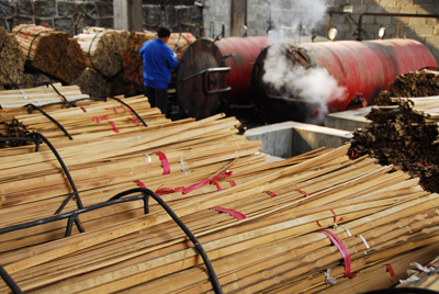 蒸煮碳化,將去掉竹片中的營(yíng)養(yǎng)成分,使得制造成的竹板材產(chǎn)品質(zhì)地更加緊密結(jié)實(shí),并且不防蟲(chóng)防蛀。