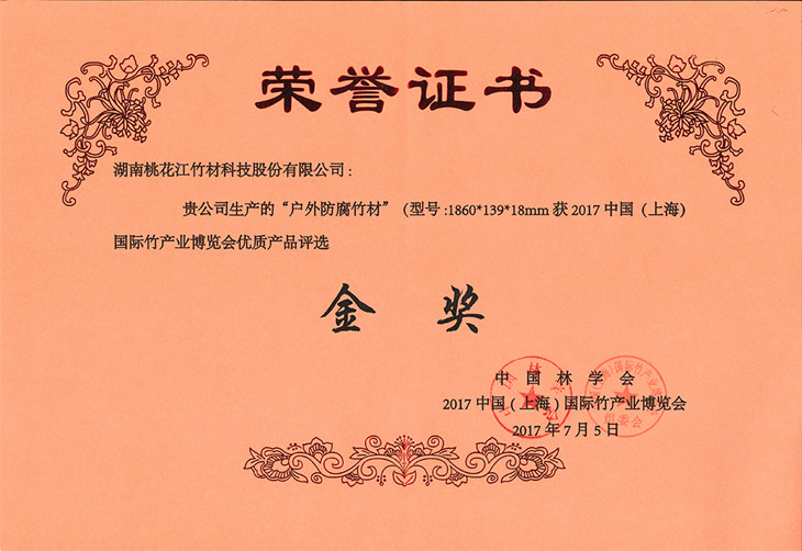 湖南桃花江竹材科技股份有限公司生產(chǎn)的戶外防腐竹地板在2017年7月中國(guó)(上海)國(guó)際竹產(chǎn)業(yè)博覽會(huì)中榮獲金獎(jiǎng),該獎(jiǎng)項(xiàng)由中國(guó)林學(xué)會(huì)、中國(guó)(上海)國(guó)際竹產(chǎn)業(yè)博覽會(huì)頒發(fā)。湖南桃花江竹材科技作為中國(guó)竹材領(lǐng)域高炭防腐技術(shù)的發(fā)明者,在中國(guó)竹材領(lǐng)域有著舉足輕重的地位。湖南桃花江竹材科技一直專注與于竹材的戶外運(yùn)用研發(fā)與創(chuàng)新,為全球客戶提供優(yōu)質(zhì)竹材。